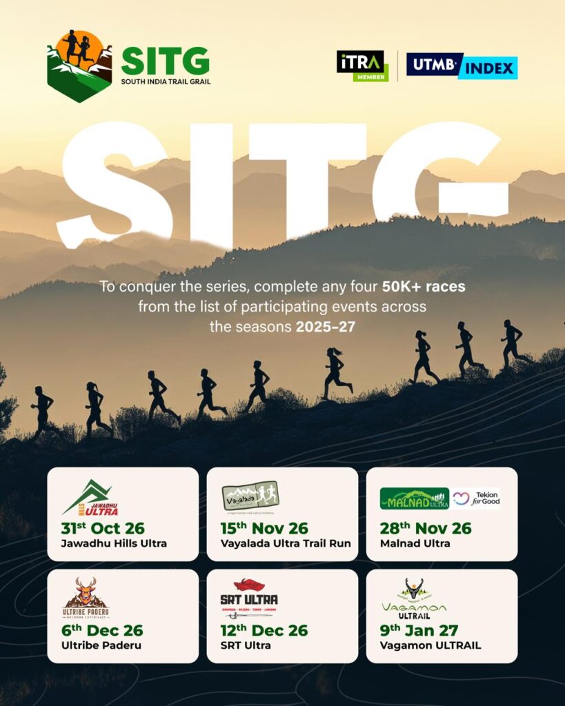 A celebration of endurance, trails, and the wild soul of the South. The South India Trail Grail (SITG) is a collaborative trail-running initiative that brings together six of South India’s most iconic and challenging ultra-distance races. Designed for athletes who crave more than just finish lines, SITG invites runners to explore, endure, and excel across diverse terrains—from the Eastern Ghats to the Western Ghats.